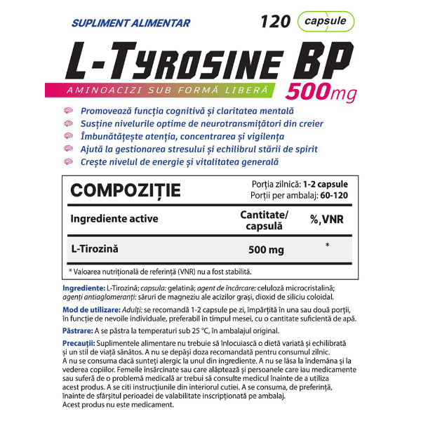 Descrierea produsului Balkan Pharmaceuticals L-Tyrosine BP 120 Caps | L-Tirozina