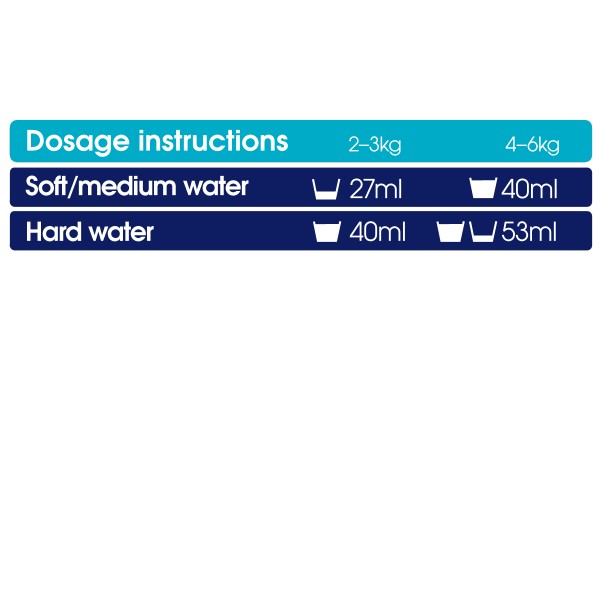 • Pentru apa cu duritate mica / medie: pentru rufe de 2-3 kg se adauga 27 ml de balsam; pentru rufe de 4-6 kg se adauga 40 ml de balsam.