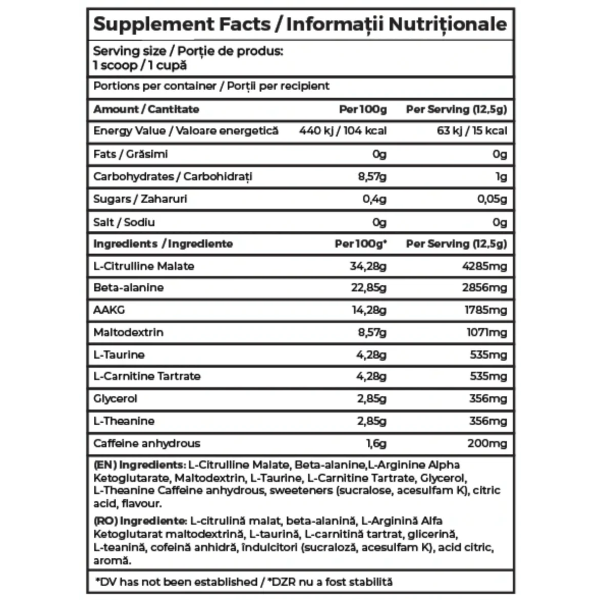Contine cafeina (200 mg per portie). Nu este recomandat minorilor si femeilor insarcinate. Beta-alanina poate provoca o senzatie inofensiva si temporara de furnicaturi sau inrosire a pielii.