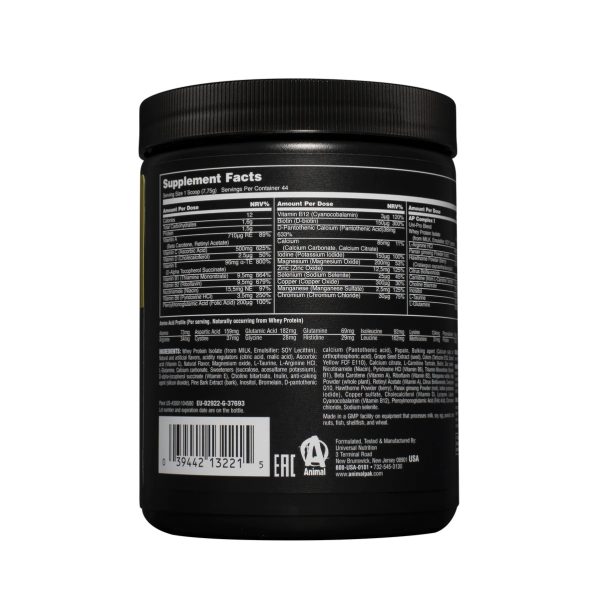 Animal Pak contine numeroase vitamine si minerale in concentratii mari, incluzand vitamina B6, tiamina, vitamina C, vitamina E. Animal Pak contine toti aminoacizii esentiali si aminoacizi cu lant ramificat. De asemenea, Animal Pak are ingrediente importante pentru imbunatatirea performantelor sportive, incluzand plante, precum extract de alge brune, extract de scoarta de pin , ginseng sau inozitolul. Aceste ingrediente sprijina organismul in timpul antrenamentelor dure.