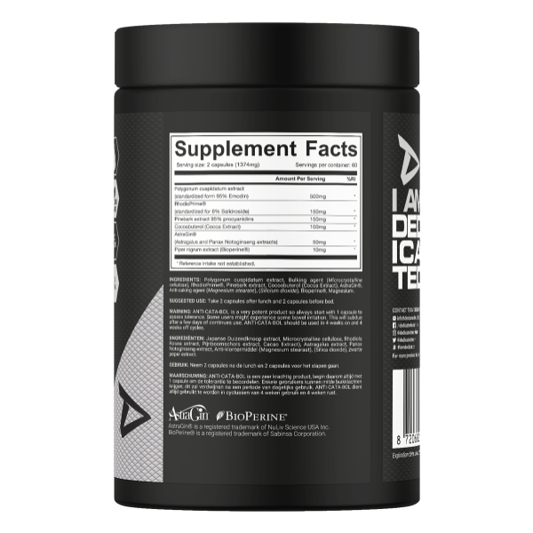 Anti-Cata-Bol™ contine o doza puternica de Emodin si alte ingrediente exclusiviste pentru a mentine cortizolul sub control. Atunci cand sunt combinate corect, aceste ingrediente ajuta organismul sa nu mai opuna rezistenta progreselor pe care le meriti din munca ta grea!