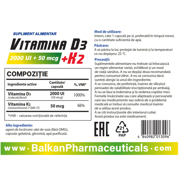Mod de administrare Balkan Pharmaceuticals Vitamina D3 + K2 30 Caps | Vitaminele D3 si K2